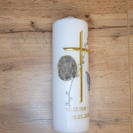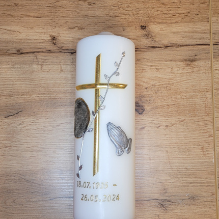 Diese wunderschöne Kerze eignet sich bestens als Geschenk um sein Beileid auszudrücken. Auf Beerdigungen werden oft Blumen niedergelegt. Doch eine Kerze kann den Hinterbliebenen auch noch nach der Beerdigung Trost spenden und zu Hause angezündet werden.