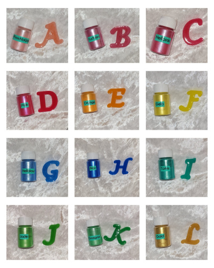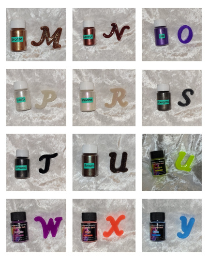 Sie können Ihren Buchstaben in vielen verschiedenen Farben mit 12 verschiedenen Glitzerflocken bestellen.